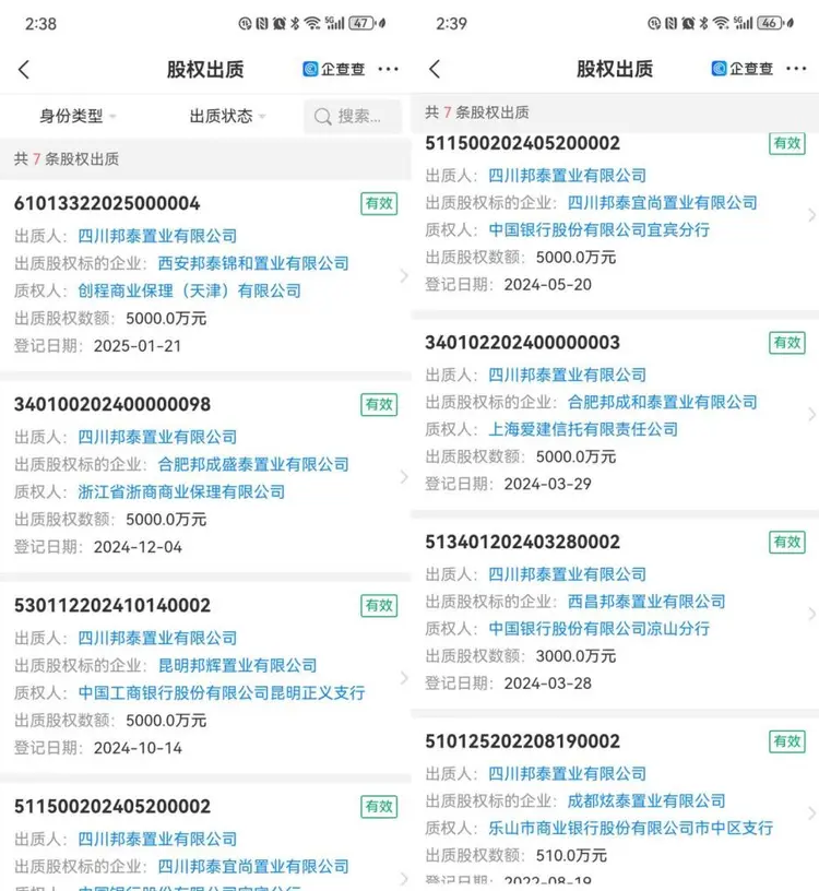 公开信息显示,邦泰置业在2022~2025年间,有7笔股权出质信息,先后将7家子公司作为标的质押给银行或金融公司,金额为2.85亿元。历史出质则超过40笔。