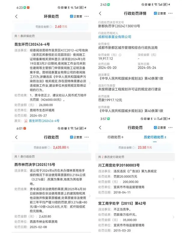 记者还发现,包括邦泰置业在内有众多公司在项目开发过程中都曾被当地职能部门处以行政处罚或环保处罚,内容包括“销售宣传与实际不符、未按规定修建擅自施工、无证非法使用土地”等。2024年5月,成都某置业公司就因未按规定建设被当地综合行政执法局罚款近2万元;昆明某置业公司也因无证施工被当地生态环境局罚款。
