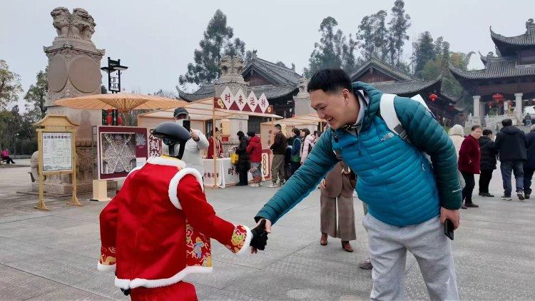 大足石刻景区。 马年春节假期,大足石刻宝顶山景区年味浓郁、游人如织。在核心打卡点瑞相广场,身着喜庆服饰的互动机器人格外抢眼,它化身热情的“景区东道主”,主动上前与往来游客互动,灵活的姿态、亲切的话语,打破了千年文物与当代游客的隔阂,让冰冷的科技拥有了温度,也让厚重的传统文化焕发了新潮活力。千年摩崖造像的古朴庄重与前沿机器人的灵动便捷相映成趣,每一次互动都碰撞出别样火花,为游客的新春之旅增添了十足惊喜,也成为景区最具人气的打卡亮点。